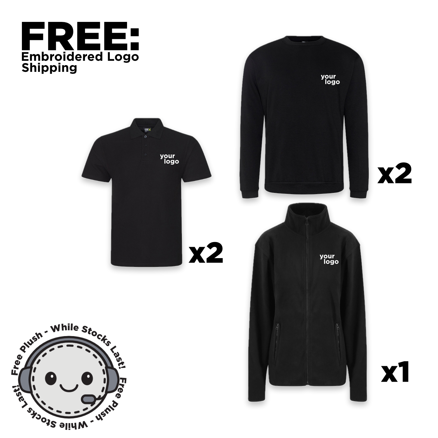 The Workwear Starter Bundle from ProRTX delivers a comprehensive welcome package for your workforce with 2 polo shirts, 2 sweatshirts, and 1 zip-up fleece. Includes embroidered logo on the left chest of each item and FREE LOGO SETUP.